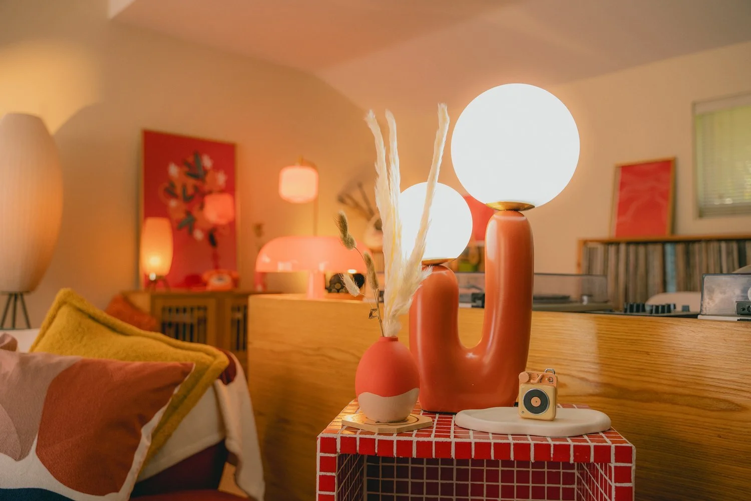 Accent lighting highlighted custom set pieces and added visual depth to the video by layering light from foreground to background. The light fixtures, crafted from a mix of materials like plastic, ceramic, glass, and paper, created a cohesive look through their eclecticism.