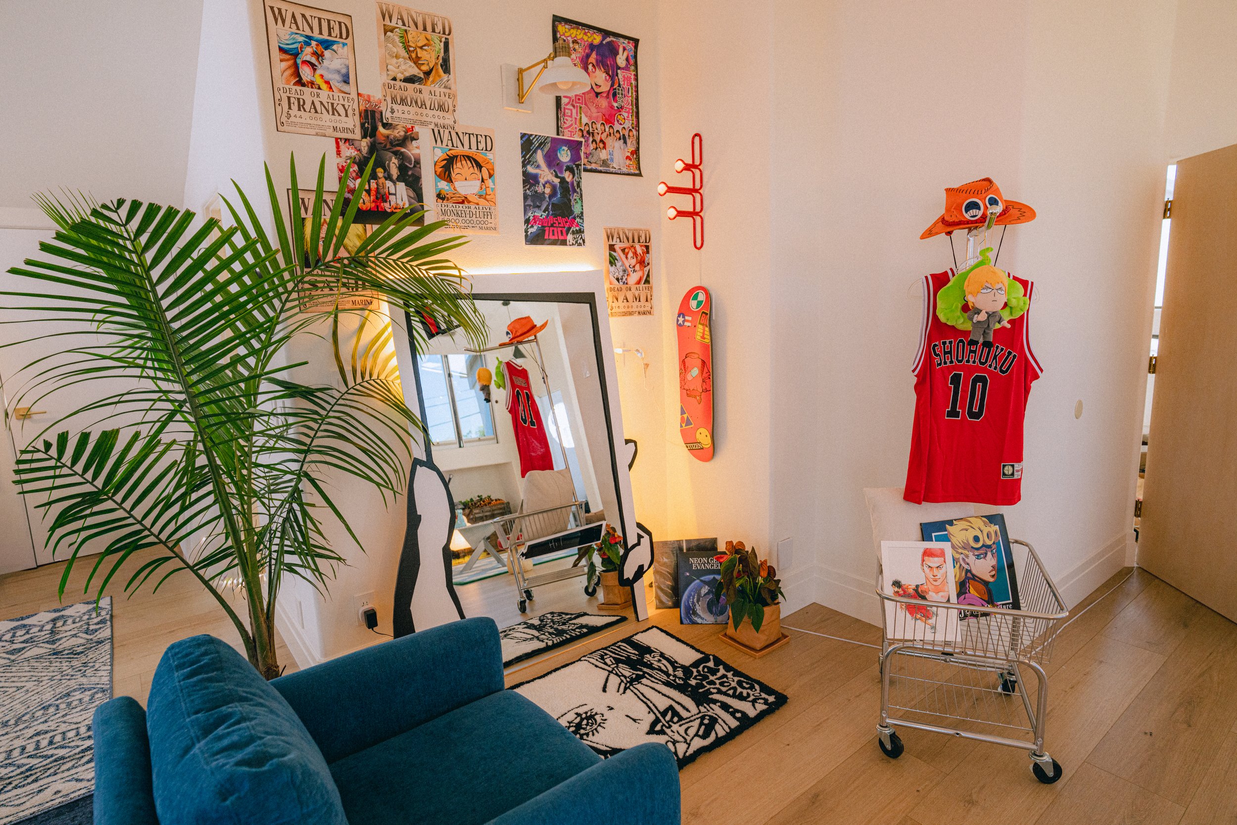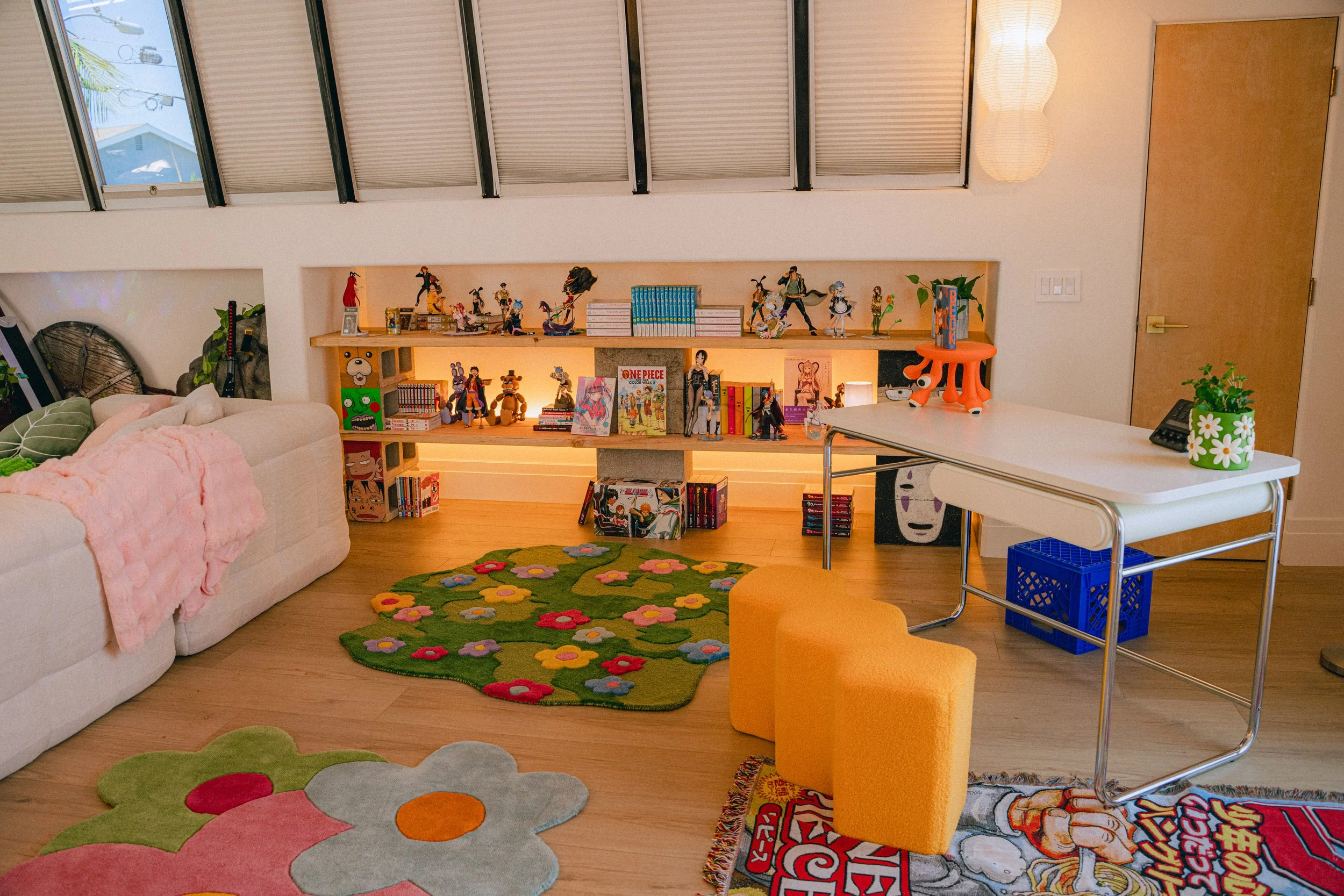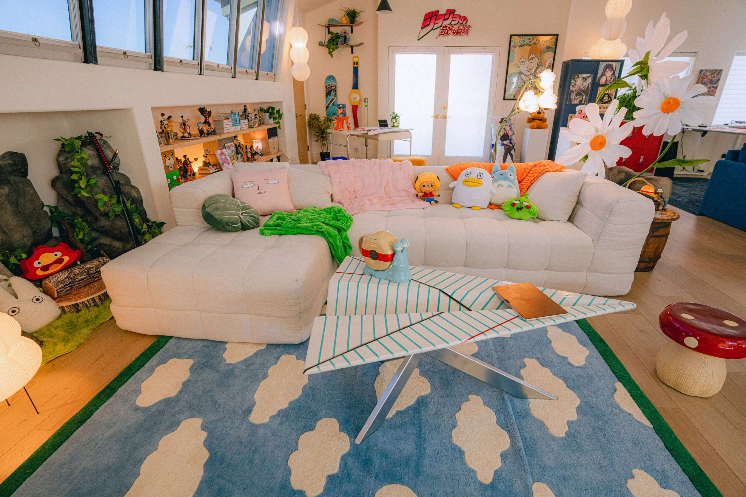 Our prop sourcing leaned on our deep love of anime and manga, letting us uncover pieces that truly resonate. For example, in the magical forest enclave we drew inspiration from Berserk, Vinland Saga, and Studio Ghibli. We connected the space to the main area through a giant daisy (nodding to Chainsaw Man) and floral rugs. In the other corner, we leaned into more retro-tech aesthetics, sourcing an oversized watch, lava lamp, and skate deck shelves.